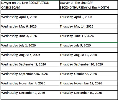 Lawyer on the Line is held on the second Thursday of each month unless otherwise noted.